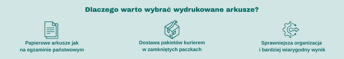 Dzięki wydrukowanej wersji arkuszy uczniowie pracują tak, jak na egzaminie CKE, co sprzyja koncentracji i zwiększa wiarygodność uzyskanego wyniku. Arkusze są dostarczane kurierem w zamkniętych paczkach, co ułatwia przygotowanie dystrybucji materiałów i pracę zespołów nadzorujących. Dzięki temu nie ma konieczności podejmowania działań tuż przed egzaminem, na ostatnią chwilę.