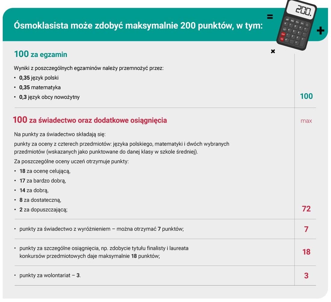 Podczas rekrutacji do szkoły średniej można zebrać łącznie 200 punktów. Aż połowę z nich stanowią wyniki uzyskane na egzaminie ósmoklasisty. Oprócz tego brane są pod uwagę także: oceny ze świadectwa, dodatkowe osiągnięcia (tytuł finalisty lub laureata konkursu przedmiotowego albo turnieju), osiągnięcia w ramach działalności społecznej (np. udokumentowana działalność ucznia jako wolontariusza) oraz świadectwo z wyróżnieniem. Szczegóły na grafice.