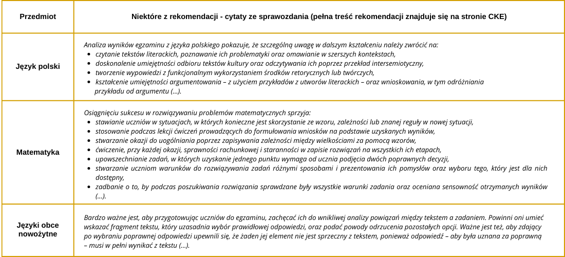 Sprawozdania dotyczące egzaminów z poszczególnych przedmiotów znajdują się na stronie CKE.