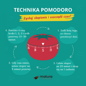 - TECHNIKA POMODORO – 25 minut nauki, 5 minut przerwy. Ta technika pomaga zwiększyć koncentrację i lepiej zarządzać czasem.