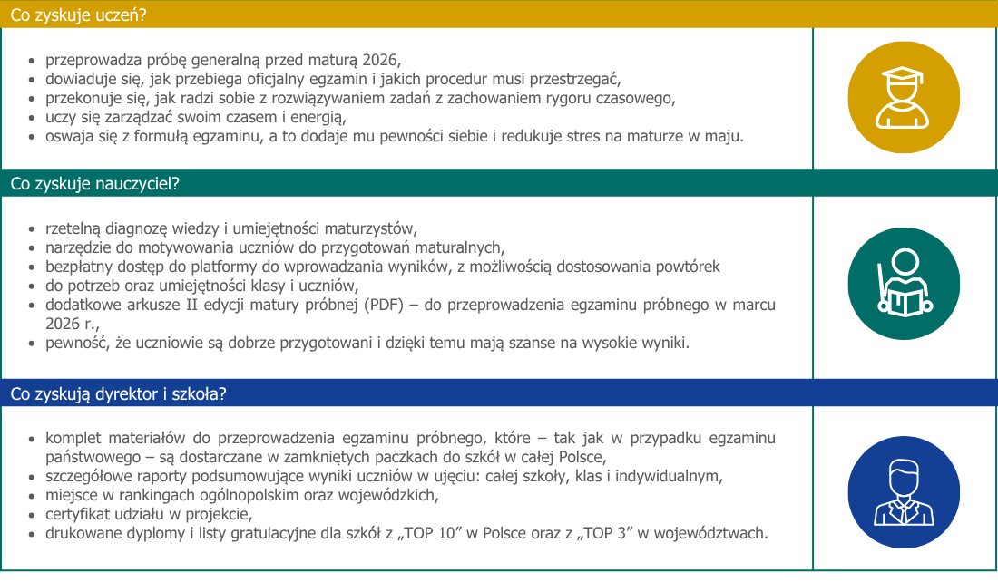 Egzamin próbny daje rzetelny obraz przygotowania uczniów do matury 2026, pozwala nauczycielom odpowiednio zaplanować powtórki i dzięki temu realnie podnosić wyniki szkoły.